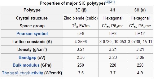 因其3.2g/cm3的比重及較高的升華溫度(約2700 °C),碳化硅很適合做為軸承或高溫爐之原料物件。在任何已能達到的壓力下,它都不會熔化,且具有相當低的化學活性。由于其高熱導性、高崩潰電場強度及高電流密度,在半導體高功率元件的應用上,不少人試著用它來取代硅[1]。此外,它與微波輻射有很強的耦合作用,并其所有之高升華點,使其可實際應用于加熱金屬。