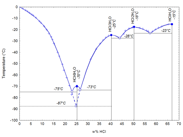 如下圖所示,鹽酸共有四個(gè)結(jié)晶的共熔點(diǎn),分別對(duì)應(yīng)四種晶體:68%(HCl的質(zhì)量分?jǐn)?shù),下同)時(shí)的HCl·H2O、51%時(shí)的HCl·2H2O、41%時(shí)的HCl·3H2O和25%時(shí)的HCl·6H2O。另外在24.8%時(shí)還有一種亞穩(wěn)的HCl·3H2O生成。