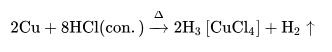 銅在無空氣時難溶于稀鹽酸,但其能溶于熱濃鹽酸中,放出氫氣: