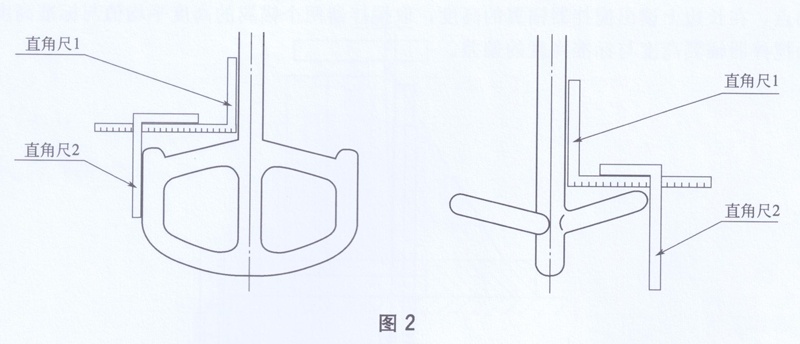 將待測攪拌器放平或豎直,如圖2所示,直角尺1的一邊貼靠在攪拌器上,另一邊與直角尺2的一邊平行貼靠,直角尺2的一邊觸碰到錨翼的端部,在直角尺1上讀取錨翼寬度值(這個值應(yīng)為錨翼端部距攪拌器軸面的最小值)。在攪拌器的另一錨翼做相同測量。對稱錨翼的錨翼寬度最大值與最小值的差為攪拌器錨翼對稱度。