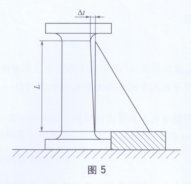 將被測(cè)管子法蘭端放置在平臺(tái)上,在緊靠法蘭邊處墊放一平行度標(biāo)準(zhǔn)圓墊塊,用直角尺貼靠在管壁上(如圖5所示),旋轉(zhuǎn)管子,用塞尺量取旋轉(zhuǎn)一周中管子上端與直角邊的最大距離△t,此值即為管件法蘭對(duì)管子的垂直度。