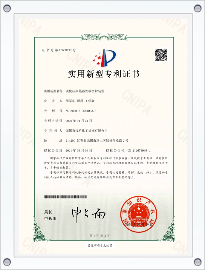 下一篇:碳化硅換熱器快速檢漏的密封裝置專利證書